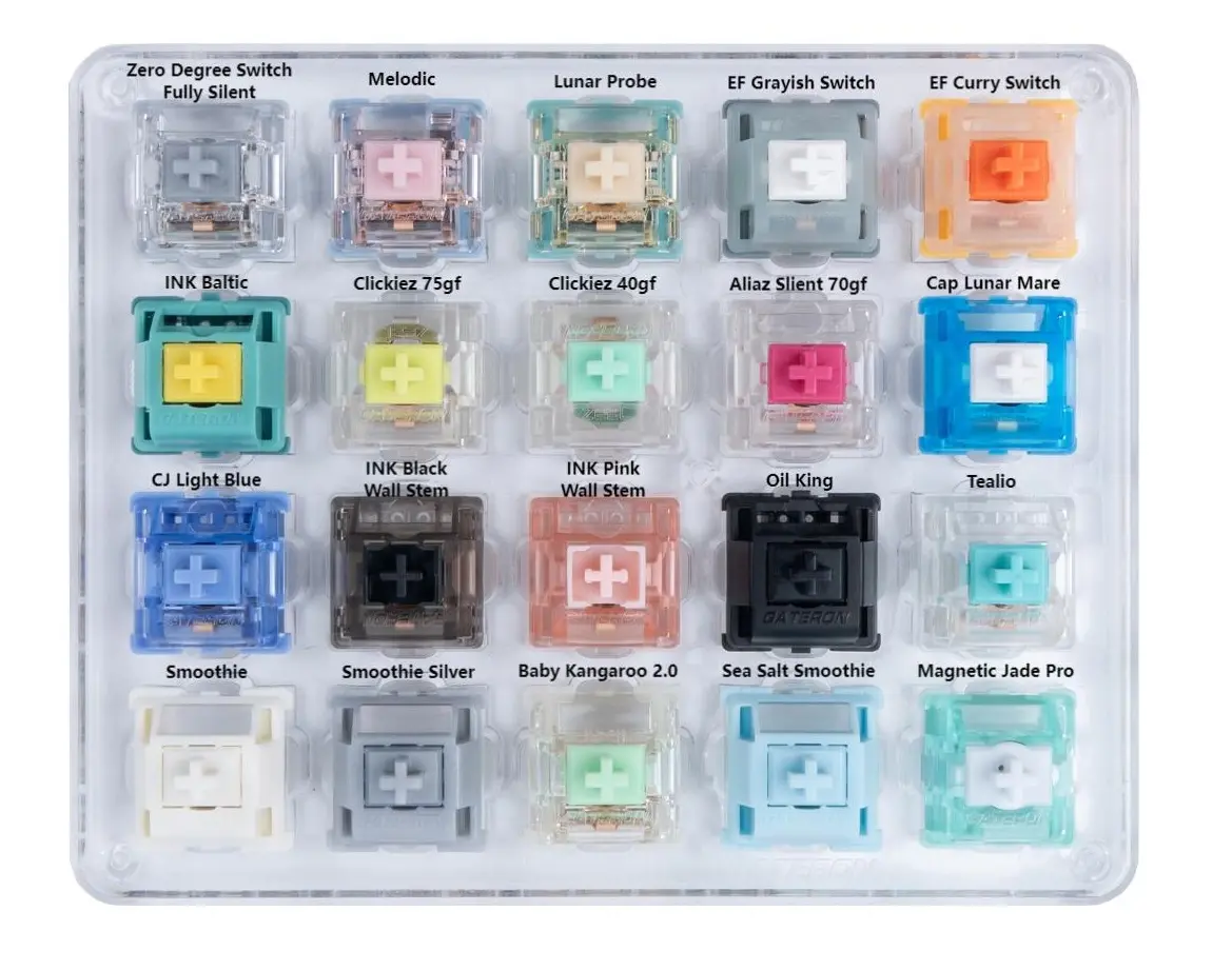 GATERON Switch Tester features 20 carefully selected switches, each offering distinct tactile and acoustic feedback. This tool helps users experience various switches to find the one that best suits their typing style. Ideal for both first-time buyers and enthusiasts looking to explore different switch types.